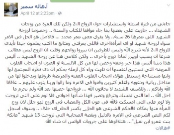 من جانبها، علقت المستشار الأسرية والتربوية "هالة سمير" على مسألة زواج أرامل الشهداء بتدوينة عبر صفحته الرسمية على موقع "فيس بوك" قائلة: "جاءتني من فترة أسئلة واستشارات حول الزواج الثاني ولكن تلك المرة من زوجات الشهداء".