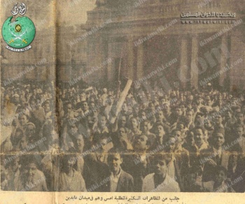 - وقد قامت في البلاد الأخرى عدة مظاهرات خرجت من المساجد إلى حيث أولياء الأمور لرفع احتجاجاتهم أيضًا، ففي المنصورة قامت مظاهرة كبيرة بدأت من مسجد الموافي وسارت تخترق الشوارع منادية بضرورة فلسطين والوقوف في وجه هذا الأسد الكاسر الذي يريد تجزئتها إذا ما دعت الحاجة، كما قامت مظاهرة كبرى في طنطا خرجت من جامع الأحمدي وأخذت تسير حتى إذا ما وصلت إلى ميدان الساعة أراد البوليس أن يفرقها فما استطاع إلى ذلك سبيلاً لأن الإخوان المسلمين أبوا إلا أن يرفعوا الاحتجاج بأنفسهم إلى أولياء الأمر وقد فعلوا.